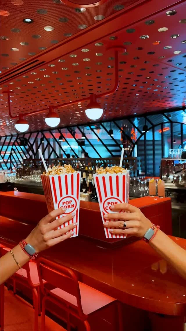 A smiling couple taking a selfie near the ocean with overwater bungalows in the background, featuring travel-themed stamps of the Eiffel Tower and Rome Colosseum.
